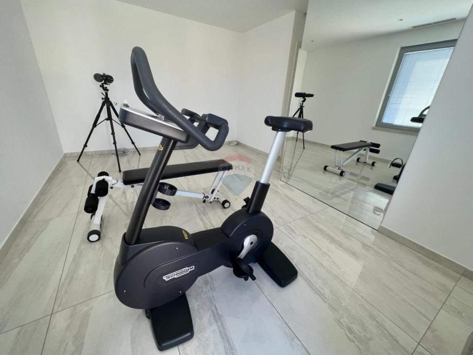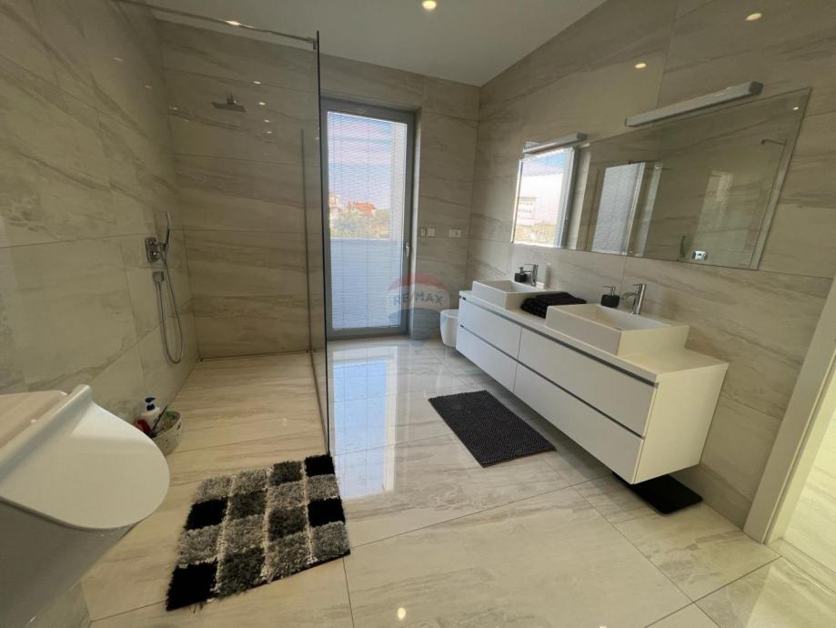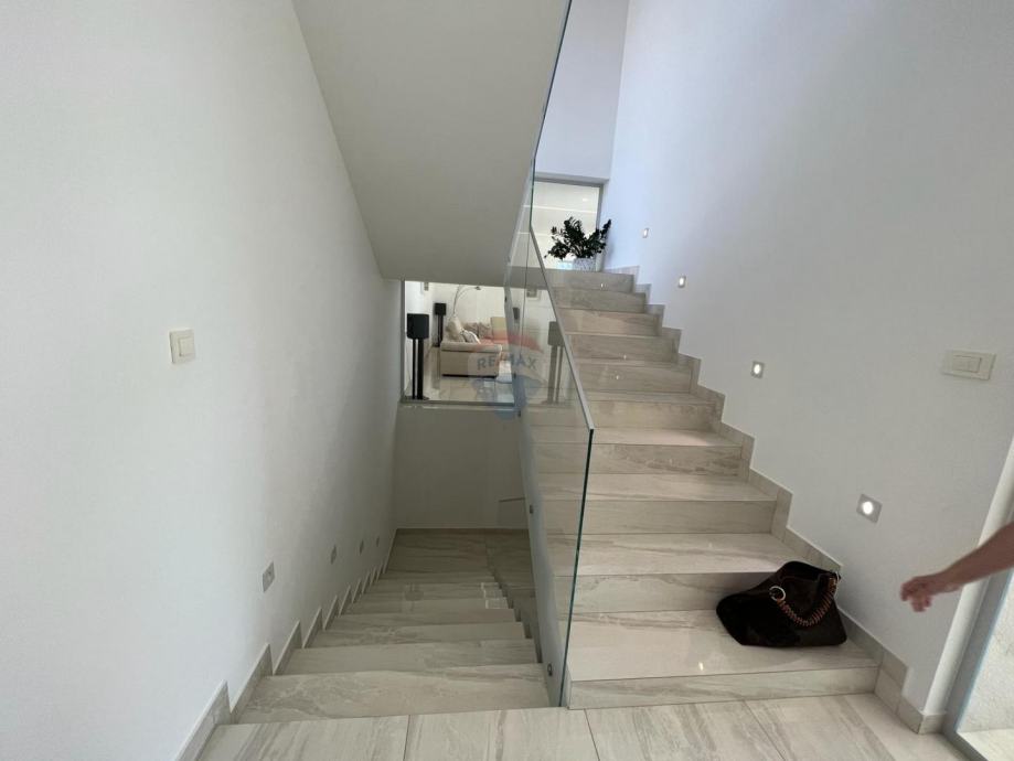Unutarnjim stepenicama dolazi se na kat gdje su smještene tri spavaće sobe sa vlastitim kupaonicama i balkonima i pogledom na more, te dodatnom prostorijom koja je trenutno u funkciji mini teretane a može biti još jedna spavaća soba.