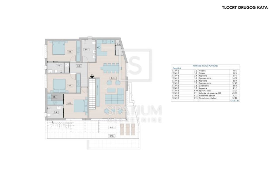 Sastoji se od ulaznog hodnika, kupaone, tri spavaće sobe od kojih dvije imaju vlastitu kupaonicu, kuhinje, ostave, blagovaonice i dnevnog boravka s izlazom na terasu.