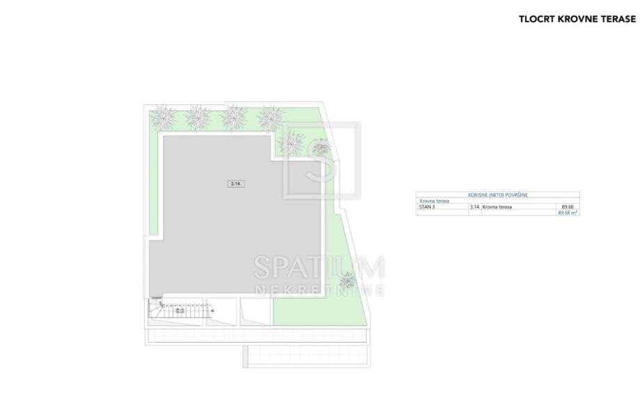GRAD KRK, u ponudu smo dobili luksuzni apartman na atraktivnoj lokaciji. Nalazi se na drugom katu i ima neto korisnu površinu od 134,91 m2. Pripada mu također 89,68 m2 terase na krovu do koje vode vanjske stepenice. Na terasi je predviđen prostor sa sunčalištem, roštiljem, barom i hidromasažnom kadom.