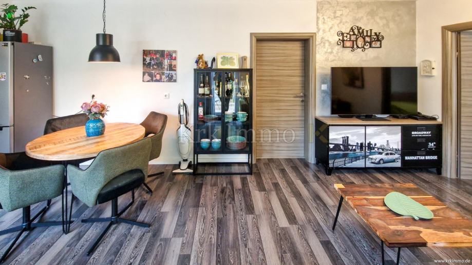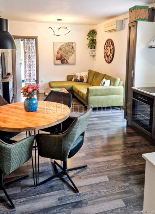 Ovaj moderan apartman predstavlja savršen izbor za one koji žele miran život u gradu Krka, blizu obale i svih gradskih sadržaja. Povezanost s prirodom i udobnost ovog doma čine ga idealnim za obiteljsko stanovanje, a isto tako i za najam u turističke svrhe.