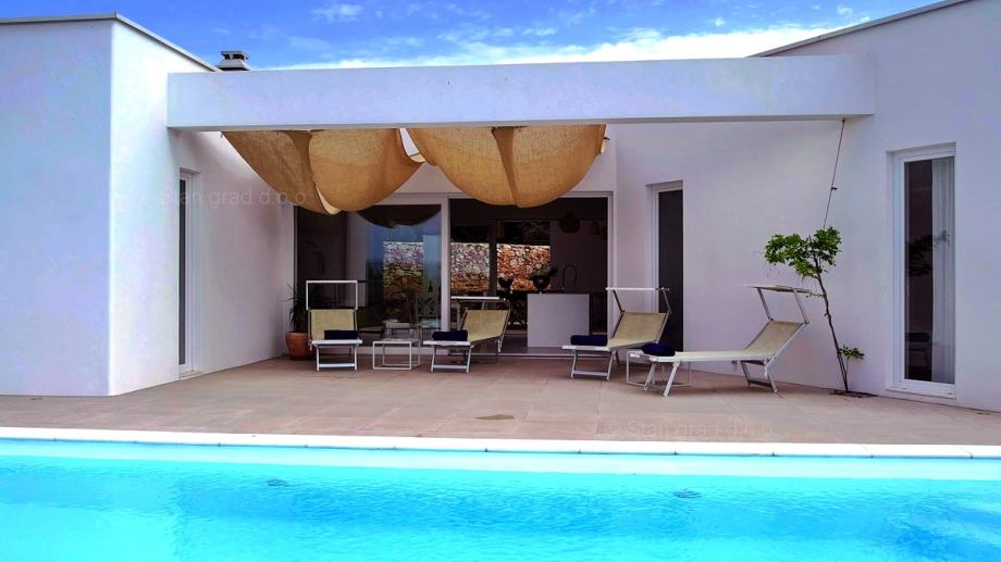 Radi se o samostojećoj kući prizemnici. Moderno projektirana kuća obuhvaća koristan prostor na sveukupno jednoj etaži. Struktura prostora predviđa stanovanje jedne obitelji. Ukupna površina obuhvaćena ovom kućom je 135 m2. U toj su površini obuhvaćeni dnevni boravak i kuhinja, 3 spavaće sobe, svaka sa svojom kupaonicom, wc, te dvije prostrane natkrivene terase. Nekretnina je kompletno opremljena modernim namještajem te suvremenom i kvalitetnom tehničkom opremom.