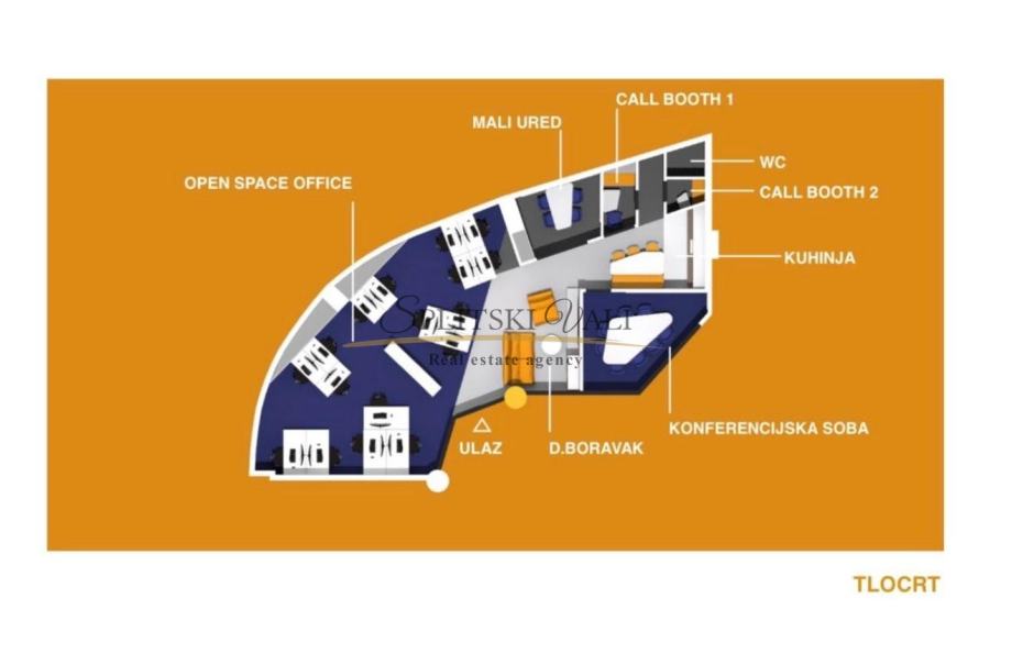 Sastoji se od glavnog uredskog dijela, lounge dijela, konferencijske sobe, potpuno opremljene kuhinje te dva WC-a.