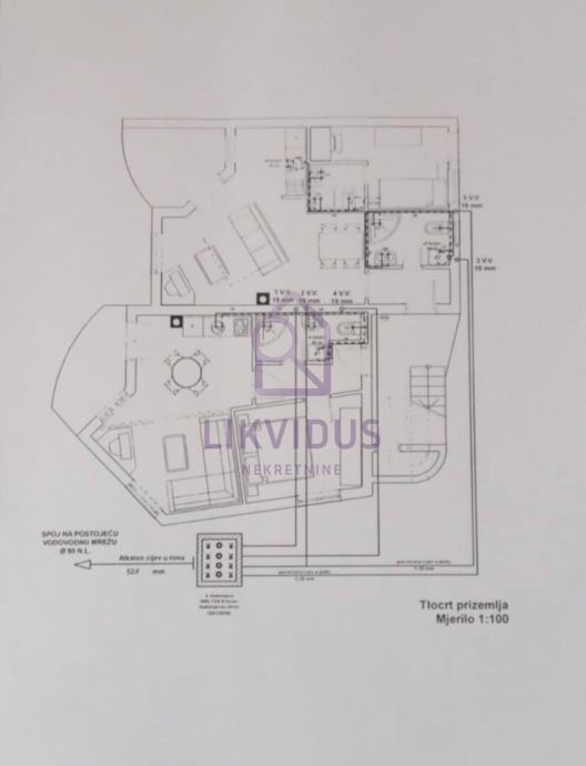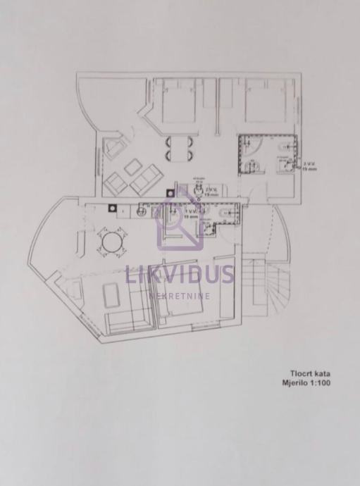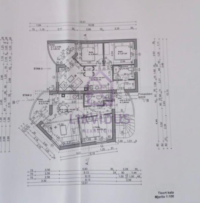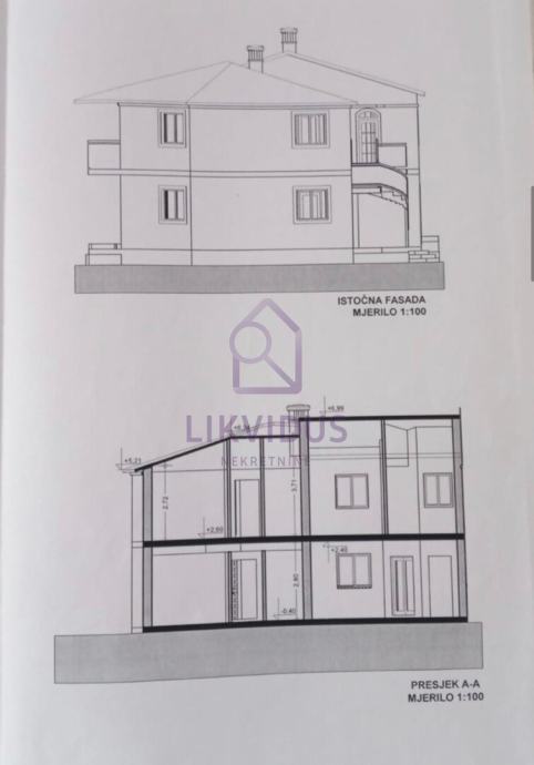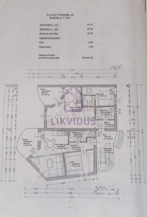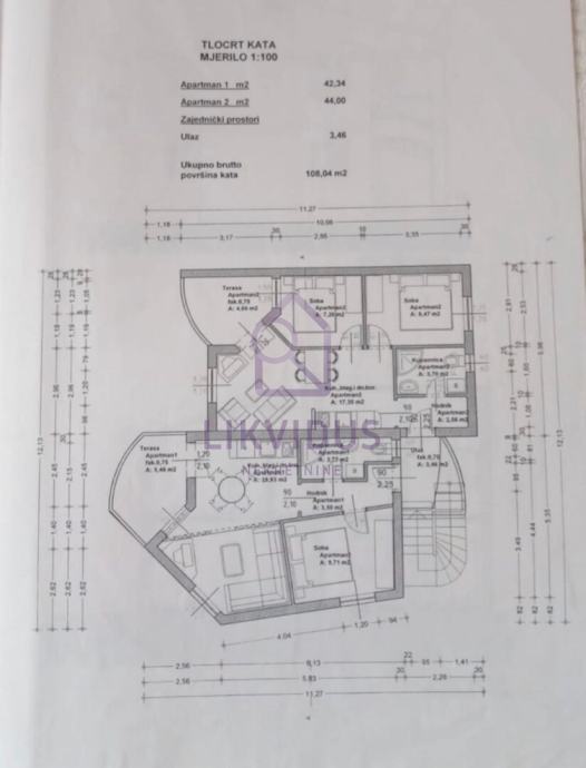 - na prvome katu (108,04 m2) - apartman od 42,34 m2, apartman od 44 m2, ulaz 3,46 m2.