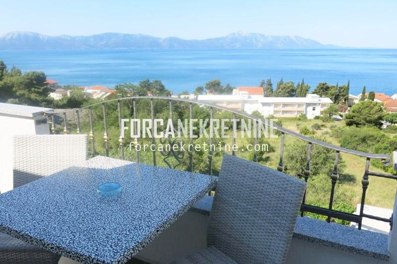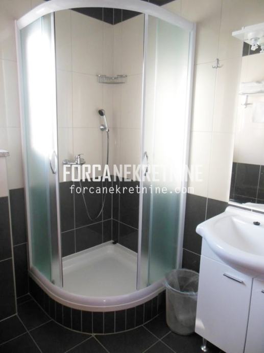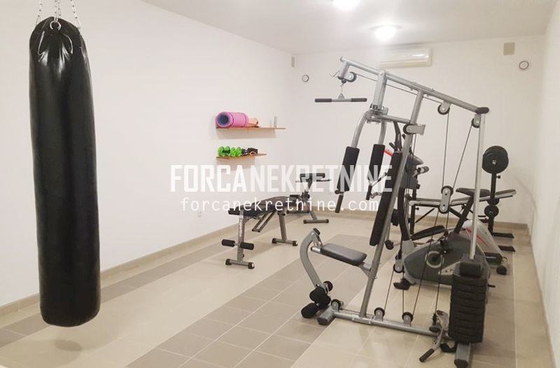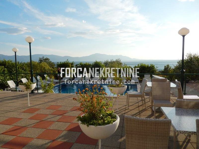 Iz prizemlja objekta se pristupa na prostranu okućnicu na kojoj je smještena terasa s bazenom i sunčalištem, dječje igralište i parkirni prostor sa sjeverne strane objekta. Ostale 3 etaže čine 24 dvokrevetne spavaće sobe s pripadajućim kupaonicama. Svaka soba ima balkon s kojeg se pruža neometan pogled prema moru. Etaže su međusobno povezane liftom. Cijeli objekt je kvalitetno uređen i opremljen (agregat za struju, sve sobe klimatizirane, SAT/TV, sef itd.), održavan i odmah spreman za korištenje. Dokumentacija uredna.