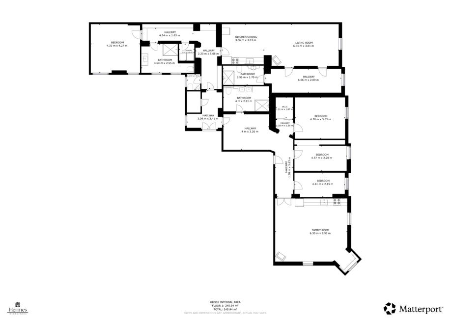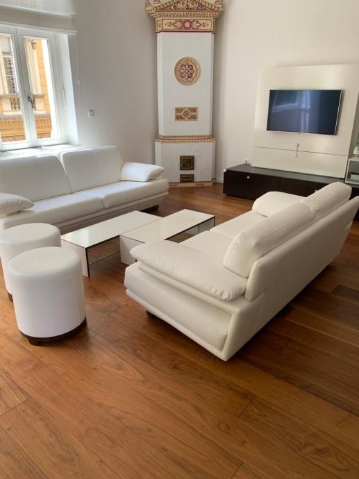 U stanu se nalaze 7 soba, 2 kuhinje, 2 garderobe, te 2 kupaonice s WC-ima, kao i 1 zasebnog WC-a. Visoki stropovi u stanu pridodaju osjećaju prostranosti.