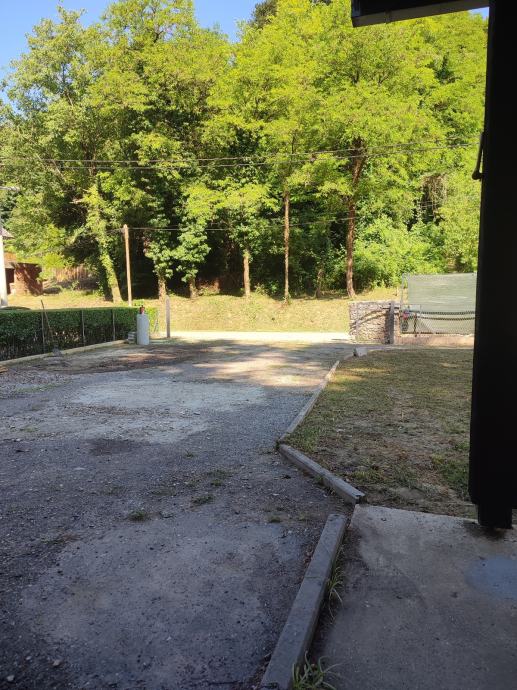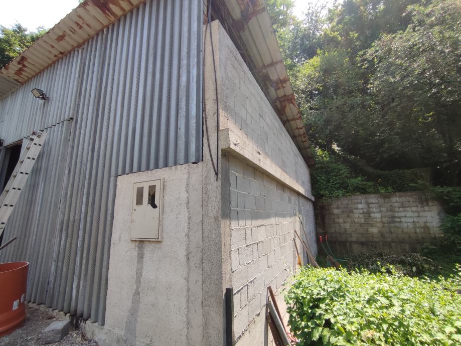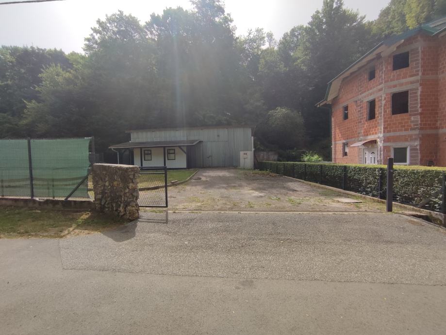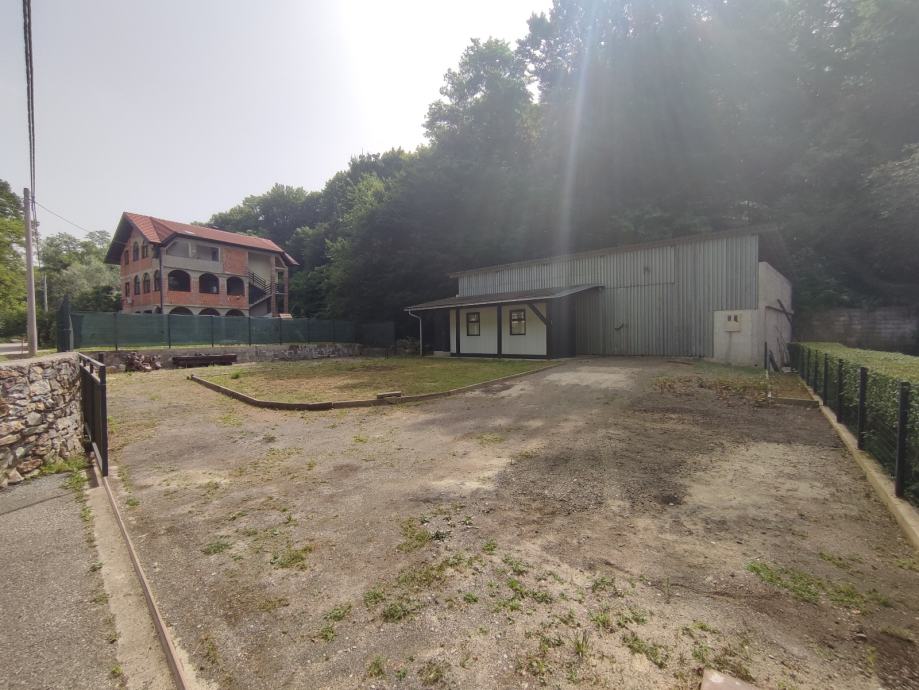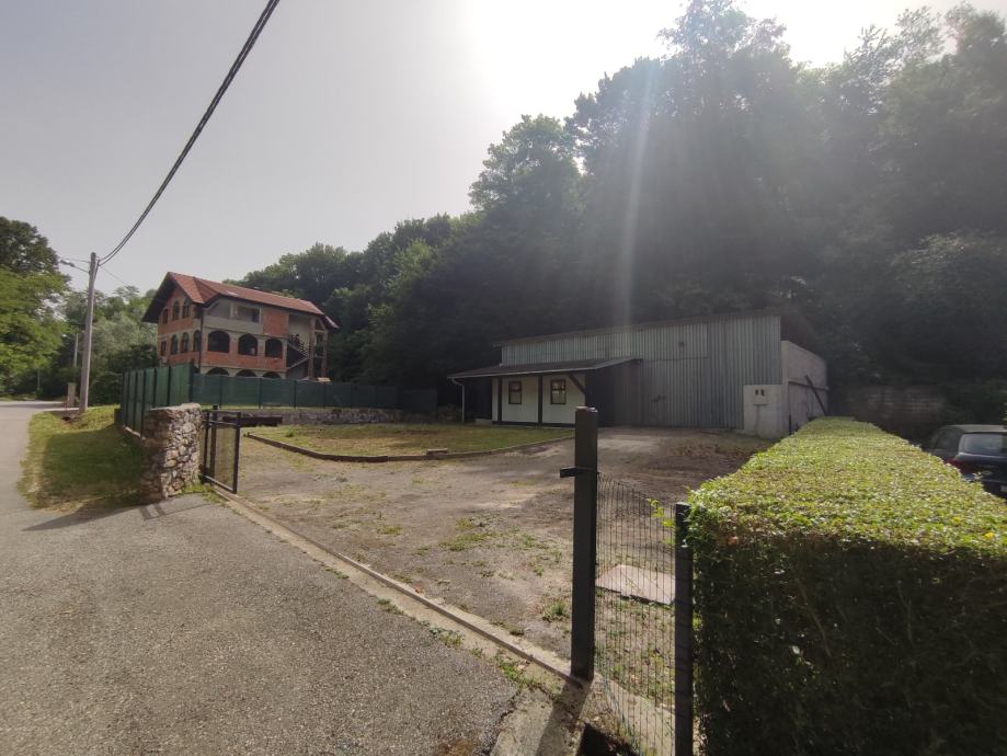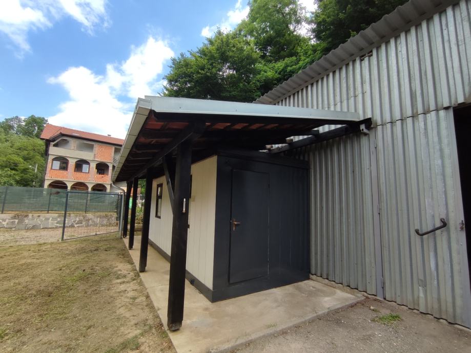 Na parceli se nalazi građevinska hala sa uredom, sanitarnim čvorom i kuhinjicom. Hala, ured i kućica imaju vodu i struju. Na parcelu se ulazi kroz velika klizna vrata dužine 5,5m, bez problema mogu ulaziti veća vozila. Hala je veličine 15x9m.Sa prednje strane je željezna konstrukcija sa limenim pokrovom, a ostala tri zida su armirano betonska sa ispunom od betonskih blokova, krov je željezna konstrukcija+ lim.Temeljna ploča je isto AB.Ulazna vrata od hale su veličine 3x3m tako da se u nju može ući kombijem ili manjim kamionom. Iza hale na povišenom djelu se nalazi prekrasna kućica za odmor od 20m2 , do nje kroz šumicu vode stepenice.