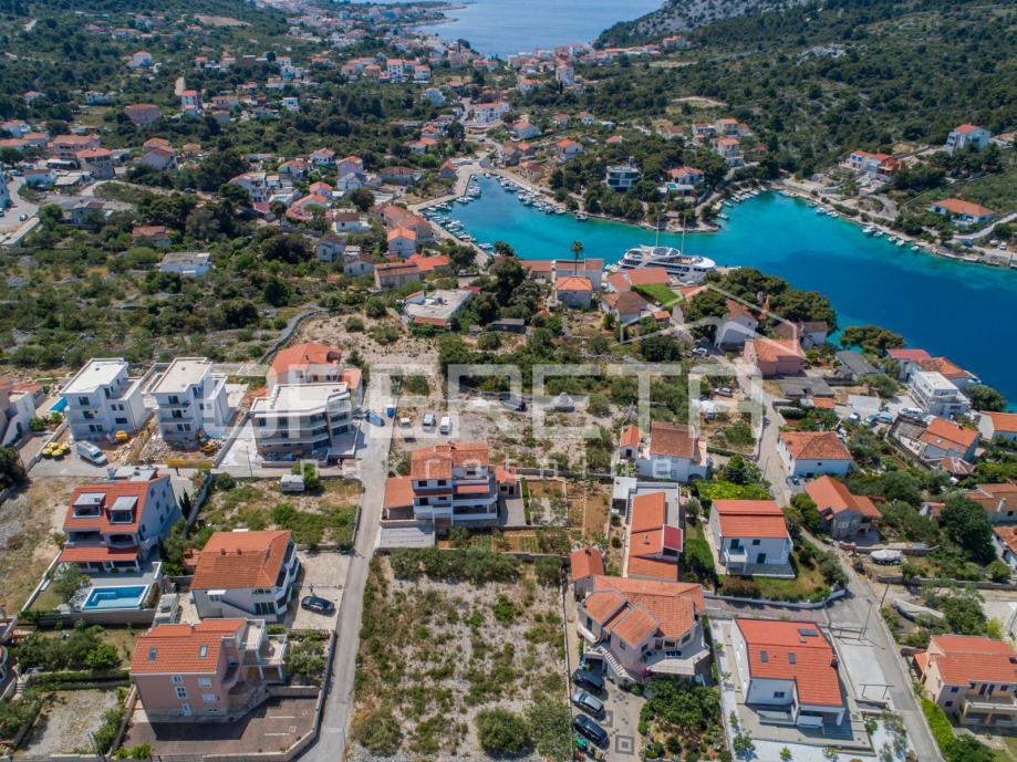 Na samo stotinjak metara od mora, na blago povišenoj lokaciji u Ražnju, smještena je građevinska parcela površine 1.445 m². Otvoren pogled na more osigurava se iz više smjerova zahvaljujući konfiguraciji terena i položaju unutar naselja.