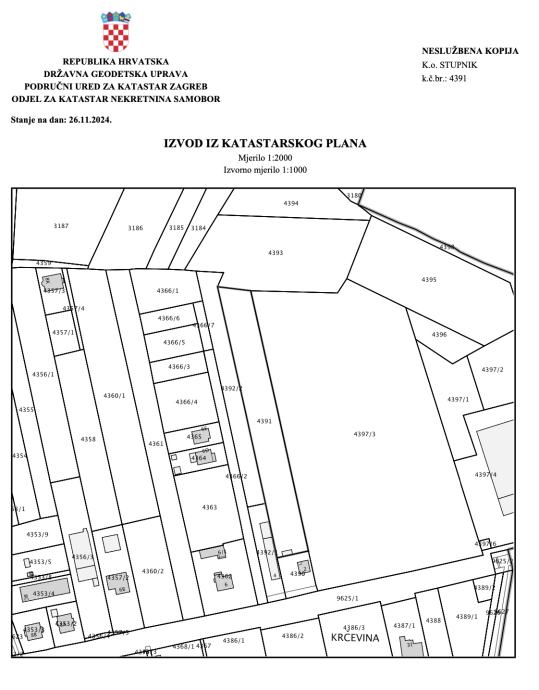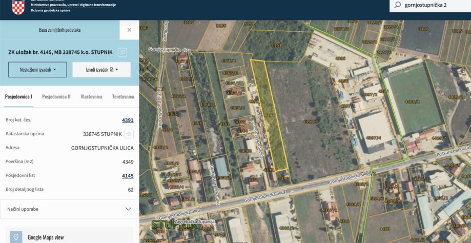 Zemljište pravokutnog oblika s postojećim objektom s priključcima na njemu. 5000m2, fronta na ulicu 25m. Zemljište se nalazi direktno na Gornjostupničkoj ulici, granica između Lučkog i Stupnika, blizina autoputa.
