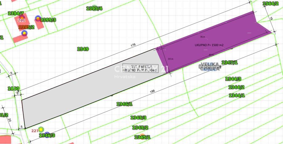 Parcela je dio građevinske parcele od ukupne površine 3575 m2, te se može parcelirati na način prikazan na grafikonu. Također, parcelu je moguće kupiti u cijelosti po cijeni od 89,000 €