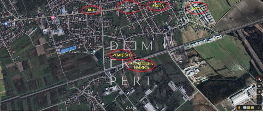 Lokacija: zemljište je udaljeno 1,5 kilometar od osnovne škole i većih trgovina. Autobusna stanica je udaljena 800, a željeznička stanica 500 metara.