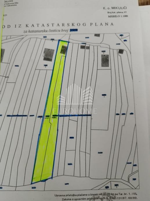 Mikulići, građevinsko zemljište 2.000 m2 , dvije spojene čestice, iznimno lijepa lokacija, južna strana, pogled na grad, zelenilo, mir, sva infrastruktura, 68 €/m2.