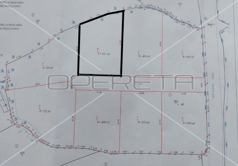 Građevinsko zemljište ukupne površine 3993 m2 koje je geodetskim elaboratom podijeljeno na 8 cjelina, površina od 408 do 532 m2.