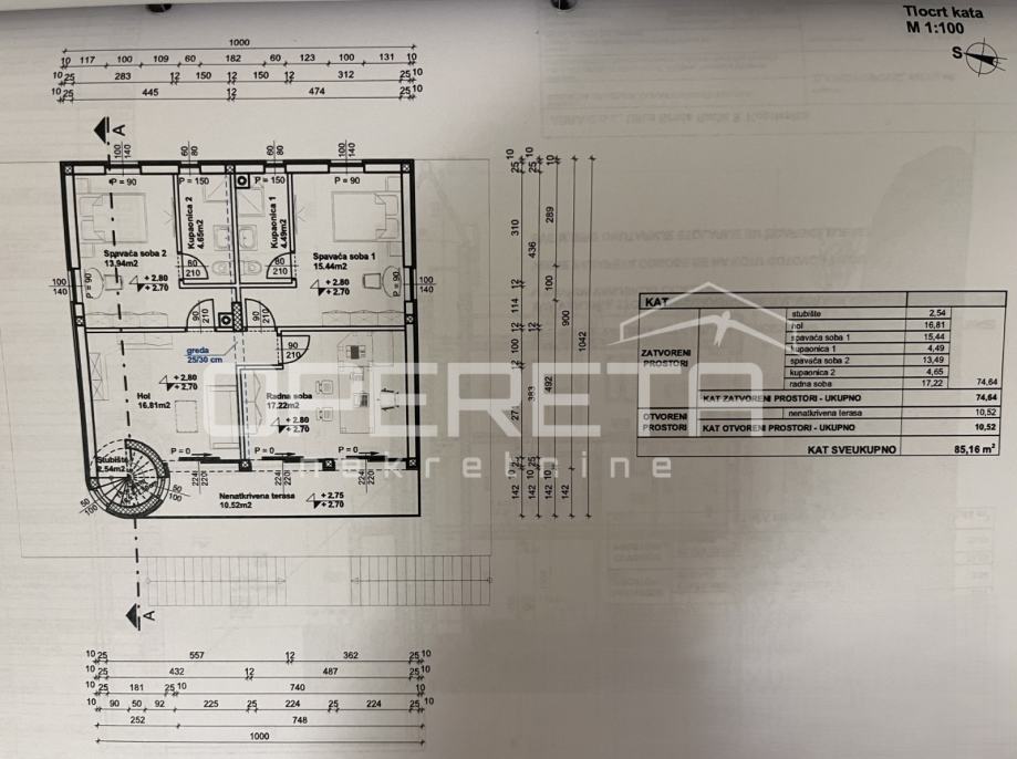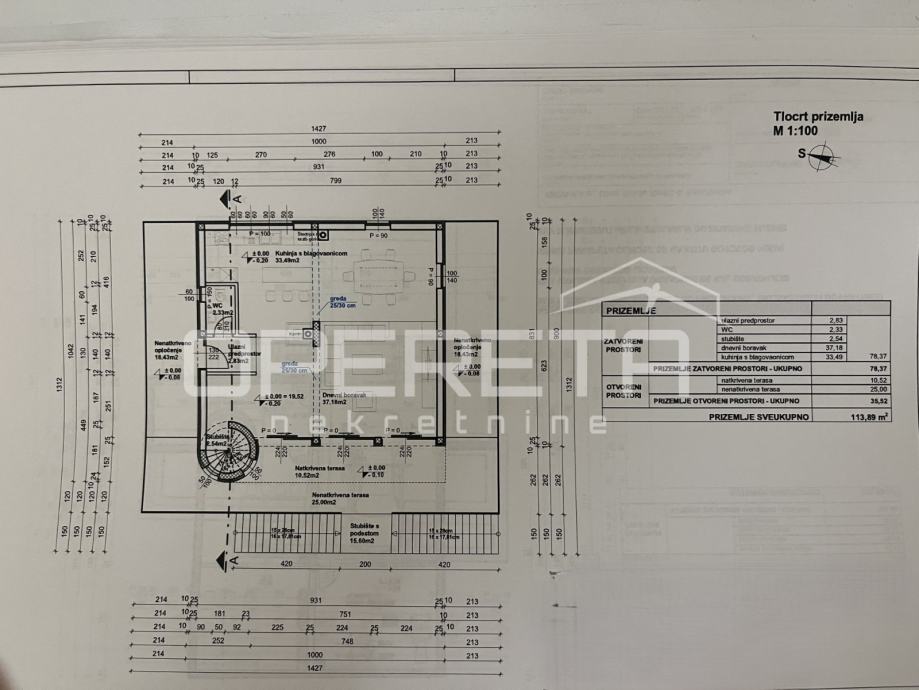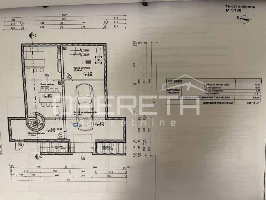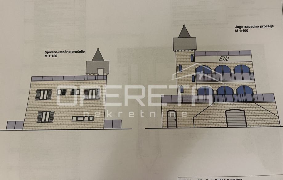 Na zemljištu postoji idejni i glavni projekt s građevinskom dozvolom, prema kojem je projektirana kuća sa suterenom, prizemljem i katom. Suteren obuhvaća garažu za osobno vozilo, spremište od oko 18 m², vinski podrum i kružno stubište, ukupne površine približno 109 m². Prizemlje uključuje ulazni predprostor, stubište, toalet, dnevni boravak, kuhinju s blagovaonicom te terase, ukupne površine s otvorenim prostorom oko 113 m². Kat se sastoji od dvije spavaće sobe, dvije kupaonice, prostranog hodnika, stubišta i terasa, ukupne površine približno 85 m².