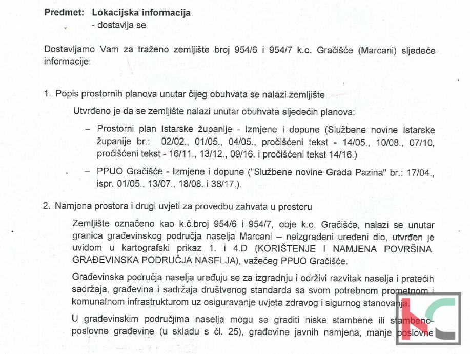 Zemljište je pravilnog pravokutnog oblika te građevinska čestica k.č. 954/6, k.o. Gračišće čija površina iznosi 511m2, se nalazi unutar granica građevinskog područja naselja Marcani i to u neizgrađenom uređenom djelu građevinskog područja, gdje je moguća gradnja obiteljske kuće ilil vile za odmor, koje se i ujedno nalaze u samom okruženju terena.