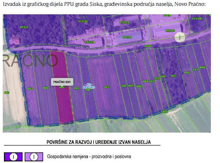 Prodaje se građevinsko zemljište u poslovno-proizvodnoj zoni Novo Pračno, 6 km od centra Siska.