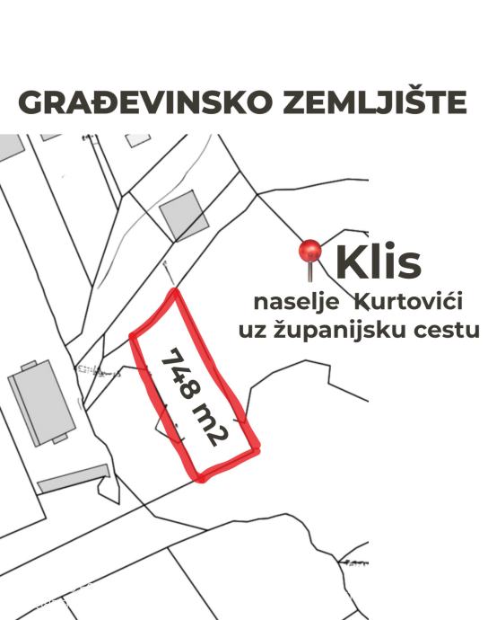 Posredujemo pri prodaji građevinskog zemljišta pravokutnog oblika u Klisu (naselje Kurtovići), približnih dimenzija 16 x 45 m, 748 m2. Zemljište se nalazi uz županijsku cestu Klis-Dugopolje, 3 km udaljeno od gospodarske zone Podi. Maksimalni koeficijent izgrađenosti je 0,2. Maksimalna katnost objekta je Po+S+P+2, pri čemu je maksimalna visina građevine 13 m. Uredno vlasništvo. Mogućnost kupnje susjednog zemljišta iste kvadrature i sličnih dimenzija.