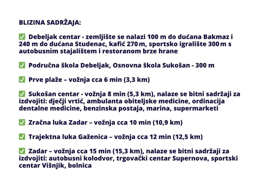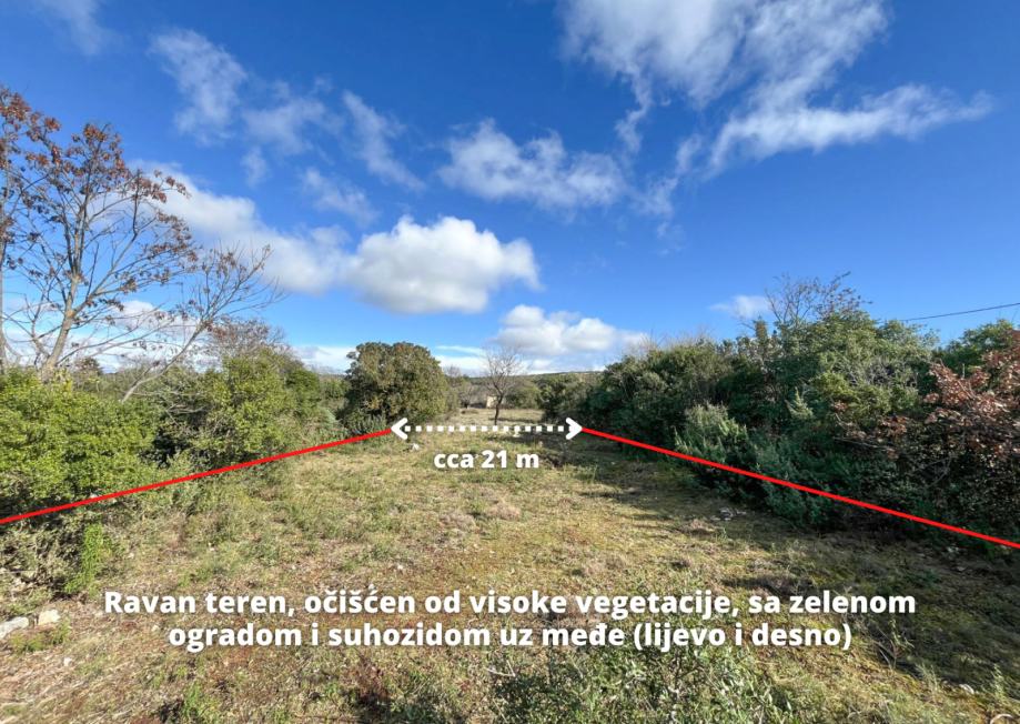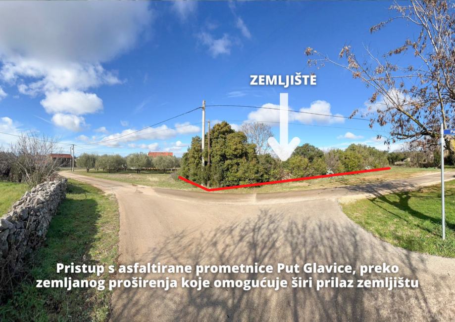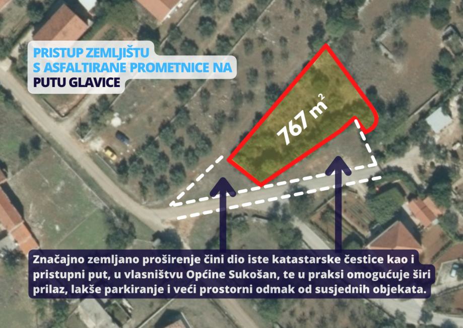 Zemljište je ravno i ima izravan kolni pristup s javne asfaltirane prometnice. Uz samu parcelu, na dijelu gdje graniči s cestom, nalazi se značajno zemljano proširenje koje čini dio iste katastarske čestice pristupnog puta, u vlasništvu Općine Sukošan, te u praksi omogućuje širi prilaz, lakše parkiranje i veći prostorni odmak od susjednih objekata.