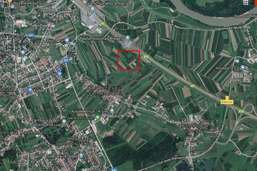 Građevinsko zemljište poslovne namjene u neposrednoj blizini naplatne postaje Bregana. Prilaz lokalnom cestom kroz Samoborski Klokočevec. Vrlo vidljivo sa autocete A3, uz samu auto cestu. Moguće je kupiti i susjedne parcele površine 3.300 m2.