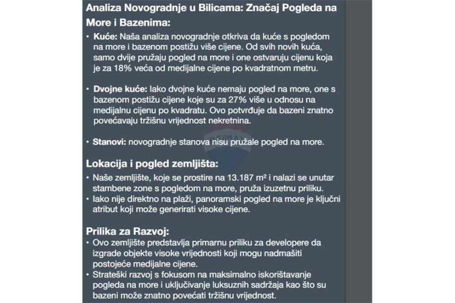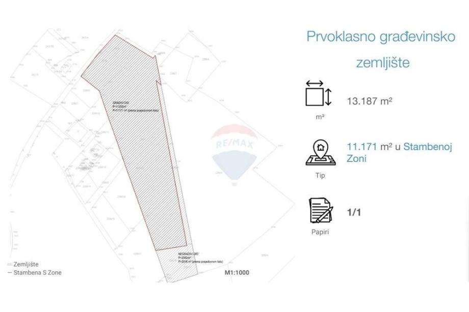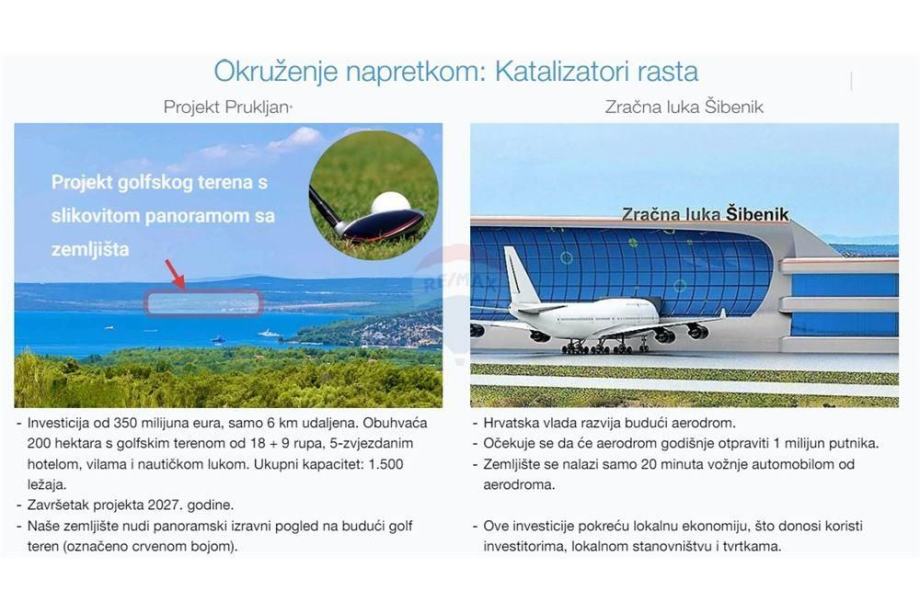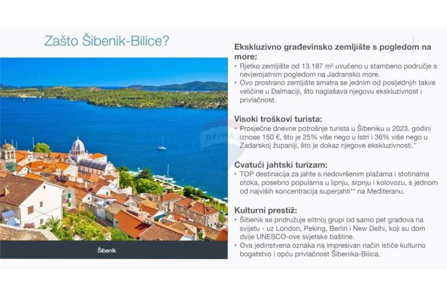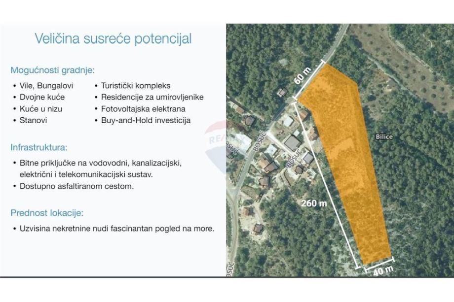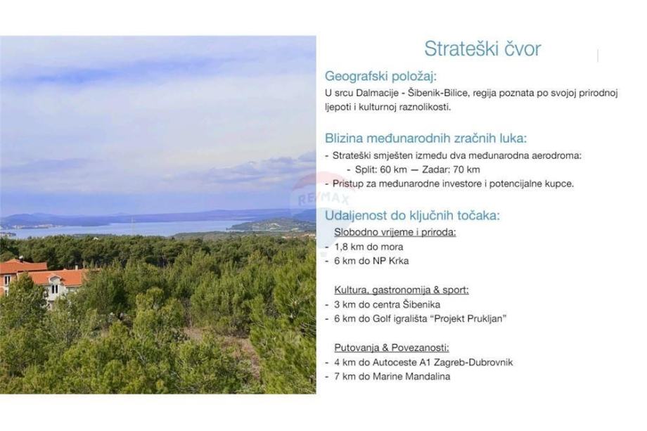 Prodaje se građevinsko zemljište sa pogledom na more. Zemljište ukupne veličine 13,187 m2, od kojih je 11,171 m2 u građevinskoj zoni, nalazi se u Bilicama pokraj Šibenika.