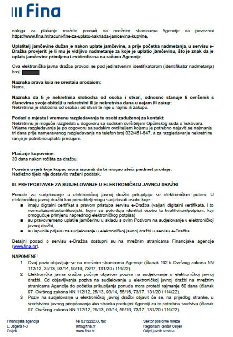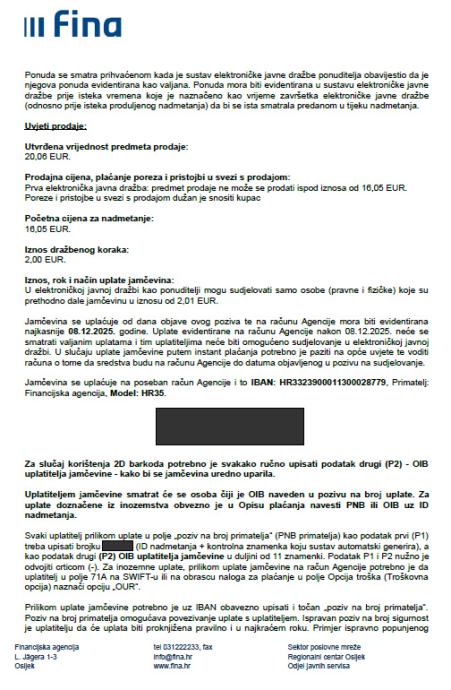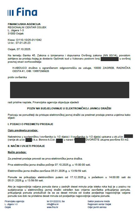Pozivaju se svi zainteresirani kupci da pristupe EJD na stranicama FINA-e, a dražbovanje je zakazano za period od 17.12.2025.-05.01.2025. godine