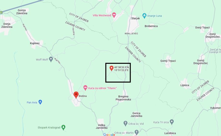 Zemljište je ravno, otvoreno prema jugu, okruženo šumom, uz pristup asfaltiranom cestom u vikendaškom mirnom naselju bez poljoprivrednih sadržaja. Udaljenost do Arena centra je 20 km, do Pisarovine je 7km, a do plaže na Kupi 12 km.