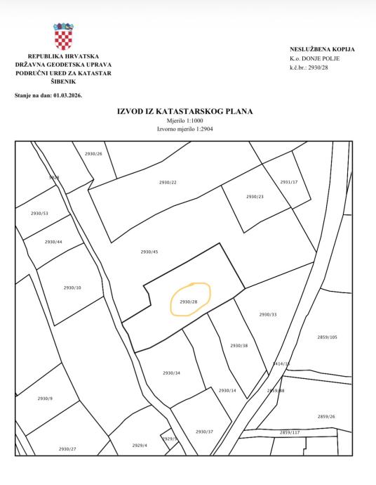 Prodaje se građevinsko zemljište u Brodarici kraj Šibenika od 1.659 m2. Cijena 170€/m2.