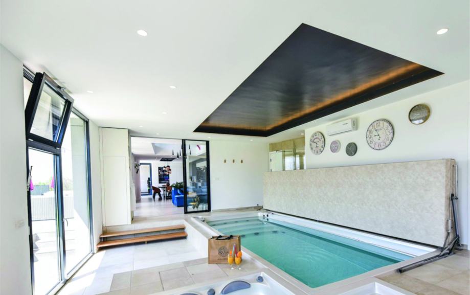 Bazen sa grijanom vodom do 40 C, inovativne tehnoligije, sa daljinjskim upravljanjem, već je plačen i spreman za isporuku(nije u cijeni parcele), ljeti je dovoljno širom otvoriti veliku staklenu stijenu, pa se osječate kao na vanjskom bazenom, sa razlikom da vam se voda u njemu ne prlja, što smanjuje troškove održavanja.