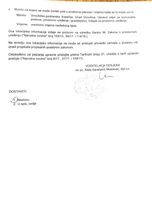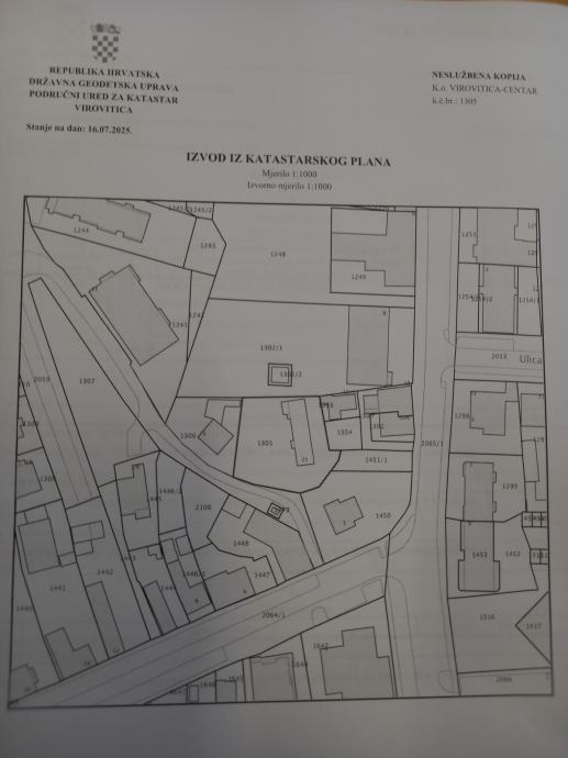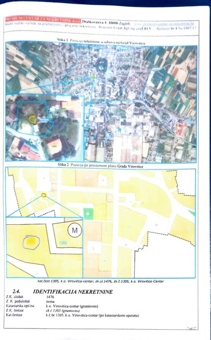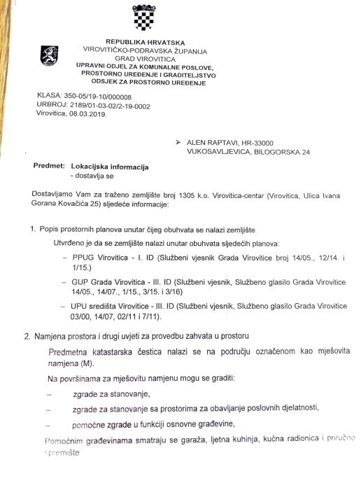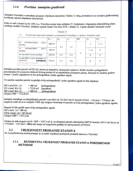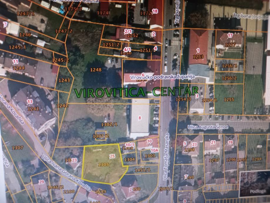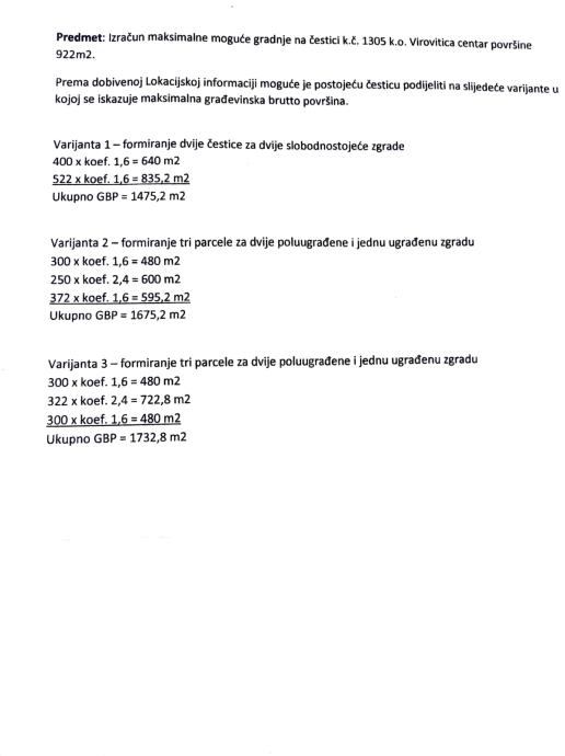 Na kčbr. 1305, k.o. Virovitica-centar, prema ranijoj i sadašnjoj lokacijskoj informaciji moguća je max. izgradivost od 1730 m2 (dvije poluugrađene i jedne ugrađene zgrade) ili nešto manje dvije slobodnostojeće zgrade, što je dobra prilika za investitore prema sadašnjoj cijeni stanova novogradnje u Virovitici od 2000 – 2500 €/m2. Vlasništvo je čisto 1/1 (jednog vlasnika) i bez tereta.