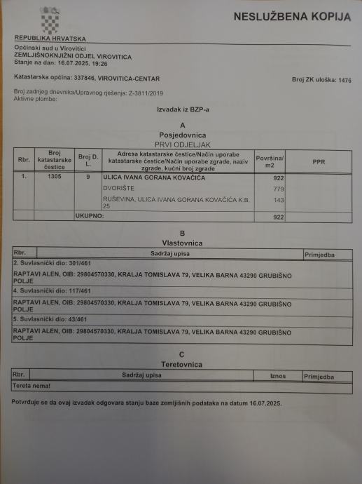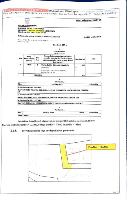 Prodajem građevinsko zemljište od 922 m2 u strogom centru VIROVITICE, u naravi je pravilna kockasta oblika, od čega dvorište 779 m2 i nekad kuća (izgrađena 1960.) sada ruševina od 143 m2.