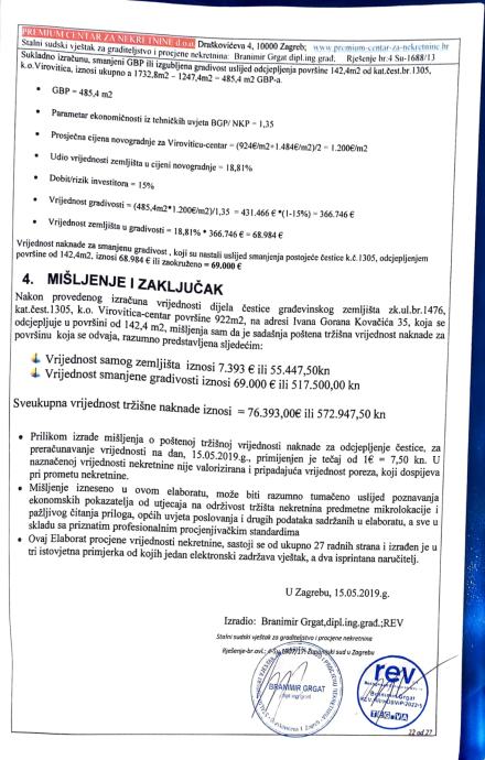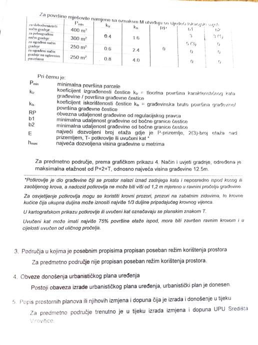 Najmanja minimalna izgradivost je oko 1250 m2, za dvije poluugrađene zgrade, samo u slučaju nastupa novih urbanističkih uvjeta i mogućeg odvajanja dijela čestice za pristupnu cestu preko navedenog zemljišta (oko 140 m2), a koja vodi iza zgrade Općinskog suda u Virovitici, za potrebe budućeg javnog parkirališta u Virovitici od 140 parkirnih mjesta na drugoj čestici.
