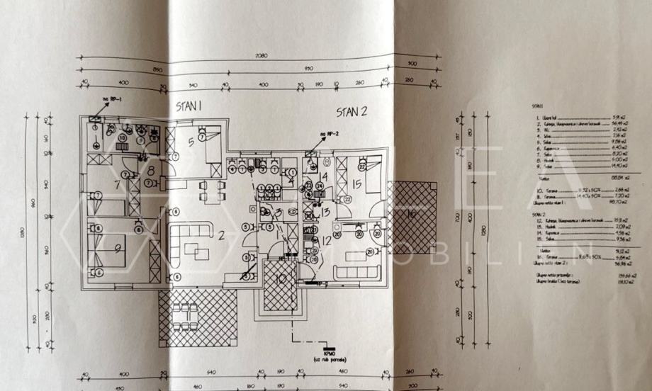 · Stan 1: 98,7 m² – dnevni boravak s kuhinjom i blagovaonicom, 2 sobe, kupaonica, WC, spremište i terasa