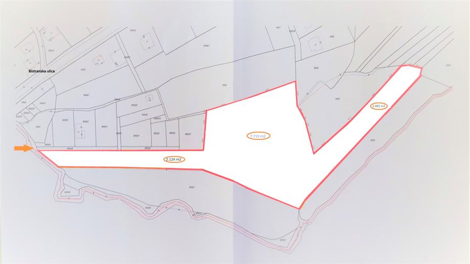 Građevinsko zemljište površine 12241 m2, cijena 32 eura/m2, koje se nalazi južno od Bistranske ulice, uvučeno 20 m3 blagi površinski pad prema potoku, s vlastitim prilazom i prostorom za parkiralište širine 15 m, površine 2124 m2 koji dovodi do cjeline od 7700 m2 pogodno za gradnju samostojećeg objekta zaštićenog od buke i pogleda te površine za rekreaciju od 2402 m2 u šumarku nedaleko od potoka.