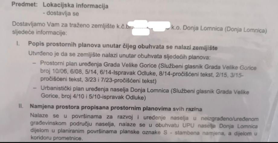 Građ.zem.1672 m2 u prigradskom naselju V. Gorice D. Lomnici svega par km udaljenosti od V. Gorice i N. Zagreba.Na zemljištu se nalaze 2 gradilišta. Uz cestu od 806 m2 i 866 m2 sa vlastitim pristupnim putem uvučeno od ceste 45 m. Oba gradilišta su u zoni stamb.namjene (S), 100% površine građevinsko. Dozvoljena je gradnja višeobiteljskog stamb.objekta do 4 stamb.jedinice, jednoobiteljskog objekta do 2 stamb.jedinice (duplex), 3-etažnog stamb.objekta na svakom od gradilišta. Koeficijent izgrađenosti je 0.4. Dostupna lokac.informacija. Uz zemljište svi kom. priključci struja,voda,kanalizacija,plin,optika. Čvor Odra /Velika Mlaka, čvor Buzin, brza cesta D-30 N. Zagreb - V. Gorica- Zrač.luka Zagreb na par minuta vožnje . Naselje ima školu,jaslice,vrtić, ambulantu,zubara,ljekarnu,poštu,trgovine, pizzeriu,kafiće,pekaru,sportske sadržaje. Za V. Goricu gradski prijevoz besplatan,uz njega voze Zet-ove linije za Zagreb. Oba gradilišta na ravnom terenu,pravilnog oblika. Ulica je sporedna i asfaltirana.Okruženje obiteljskih kuća. Uredno vlasništvo 1/1,bez tereta. Lokacija je brzorastuća, te je odlična prilika za investiciju. Mogućnost prodaje cijelog zemljišta ili po gradilištu.Položaj gradilišta se ističe odličnom prometnom povezanošću i blizini svi urbanih sadržaja,a istovremeno nudi mir i privatnost .Bez agencijske provizije. Mob. 091/ 5185-075