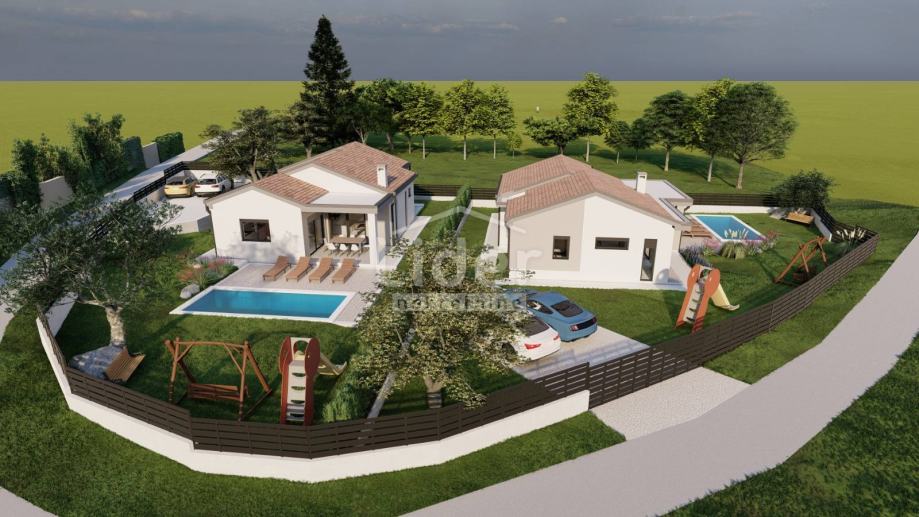 Na prodaju atraktivno građevinsko zemljište u mirnom selu nedaleko od Svetvinčenta! Riječ je o dvije susjedne parcele, svaka površine cca 520 m², s već ishođenim građevinskim dozvolama za izgradnju prizemnih kuća s bazenom – savršeno za odmor ili investiciju.
