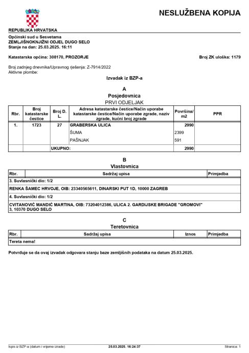 Parcela se sastoji od ukupno 2990 m2 od čega je 2399 m2 šuma, dok je ostatak od 591 m2 pašnjak u građevinskoj zoni (prenamjena nije potrebna, automatski se odrađuje prilikom formiranja građevinske parcele). Prodaje se polovica vlasništva (1.199,5 m2 šume te 295,5 m2 pašnjaka u građevinskoj zoni).