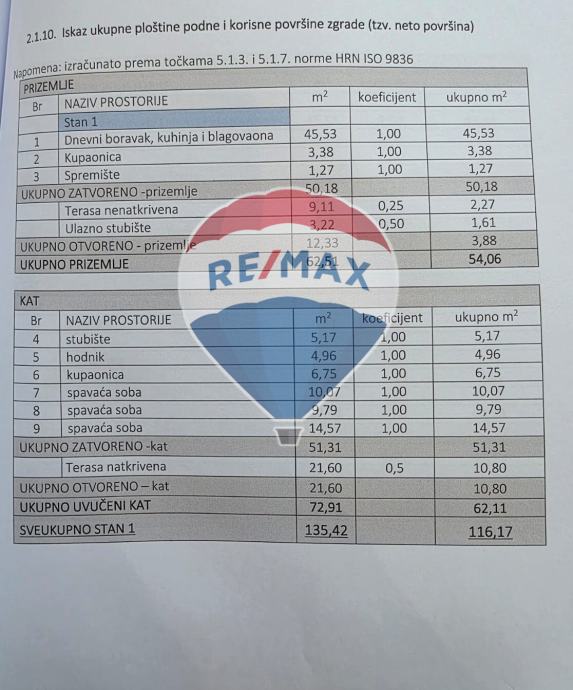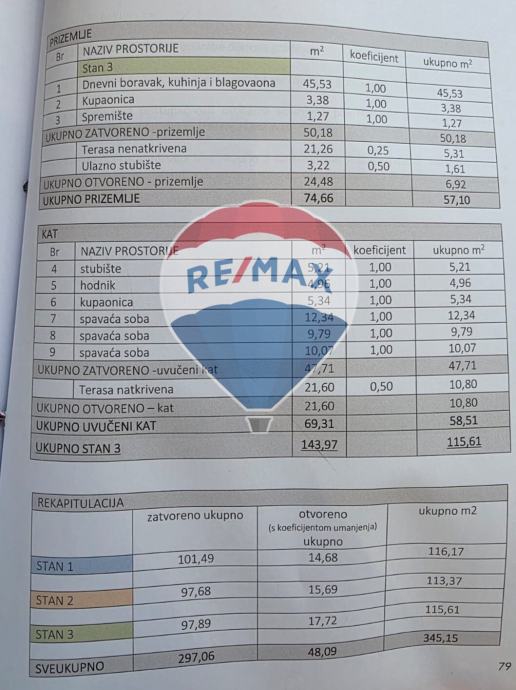 Prvi stan ima neto površinu 113 m², drugi 115 m², a treći 116 m². Svaki stan u prizemlju ima ulazno stubište, kuhinju, blagovaonu i dnevni boravak, spremište i nenatkrivenu terasu. Unutarnje stubište vodi na 1.kat koji se sastoji od hodnika, kupaonice, tri spavaće sobe i natkrivene terase. Osim navedenog, svakom stanu pripada jedno natkriveno parkirno mjesto koje nije uračunato u ukupnu površinu stana.