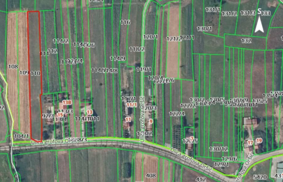 Prodaje se građevinsko zemljište površine 3.755 m2 u nizinskom dijelu mjesta, u mirnom odvojku ulice s nekoliko obiteljskih kuća.