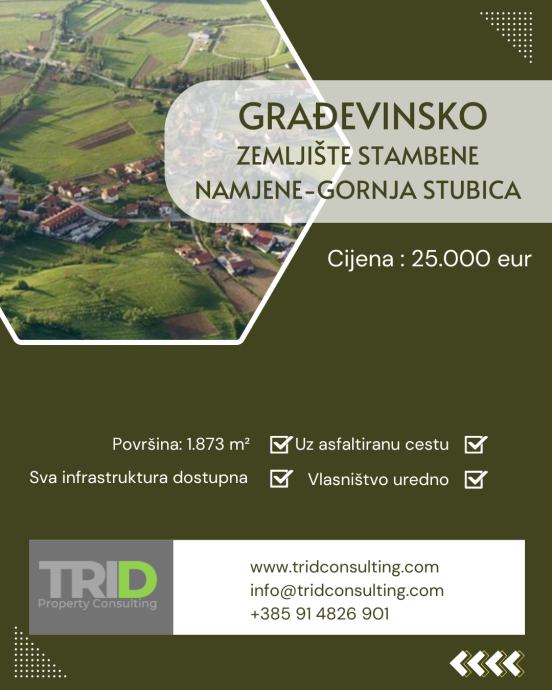 Na prodaju građevinsko zemljište površine 1.873 m² u mirnom dijelu Gornje Stubice, idealno za izgradnju obiteljske kuće ili manjeg stambenog objekta.
