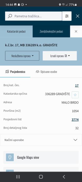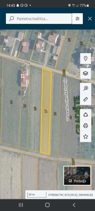 Prodajem građevinsko zemljište površine 1054m2. Zemljište se nalazi u Gradištu “na brdu” (poštanski broj 32273, između Županje i Cerne). Skroz u nizu u toj ulici se nalaze kuće te po neka oranica. Provedena je struja, voda, plin. Dužina je 100m, širina 10,54m.