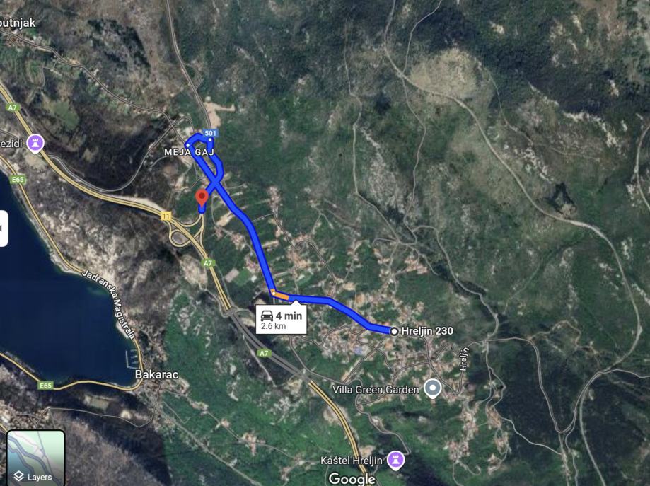 Zemljište je u naravi ruševina, tik do ceste, u neposrednoj blizini autobusne postaje (približna udaljenost 20 m). Nalazi se u centru mjesta, u blizini dječjeg vrtića, crkve, ljekarne i ostalih sadržaja. Brz prisup autocesti i dobra povezanost s Rijekom te ostalim naseljima. Pogodno za komercijalnu i stambenu namjenu.