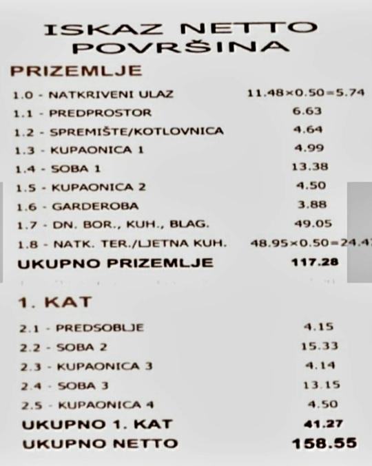 Projekt je predviđen za gradnju objekta površine 158.55 m2 netto, sa izvrsnim i traženim konceptom kuće gdje će se u prizemlju smjestiti veliki i open space prostori ( dnevni boravak, kuhinja s blagovaonom, kupatilom i jednom sobom, dok unutarnjim stepeništem se dolazi na 2 etažu gdje je predviđeno 2 sobe svaka sa svojom kupaonicom, te predprostora koji može imati i drugu namjenu.