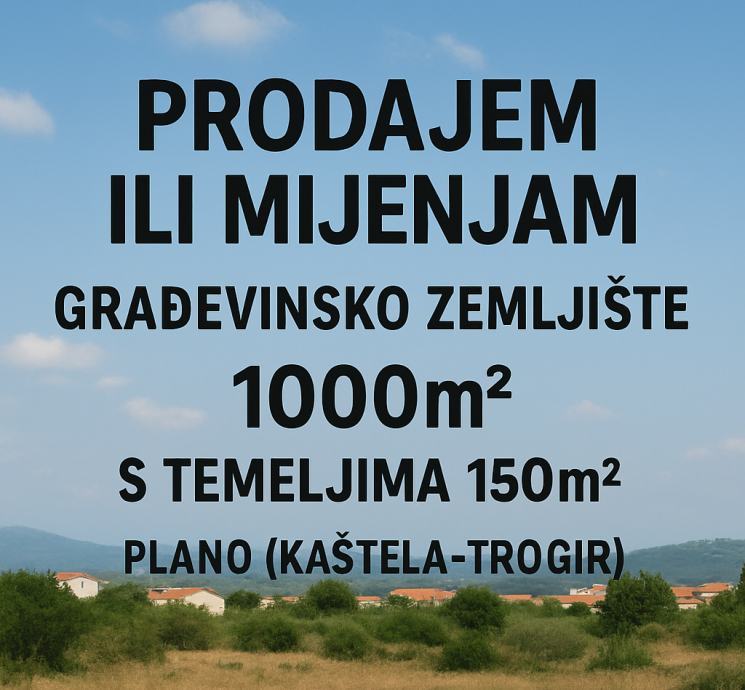 Prodajem ili mijenjam građevinsko zemljište površine 999 m² u mjestu Plano, između Trogira i Kaštela, udaljeno samo 3 km od mora i Zračne luke Split. Zamjene me zanimaju - stan ili kuća u Zagrebu, moja ili Vaša nadoplata moguća.