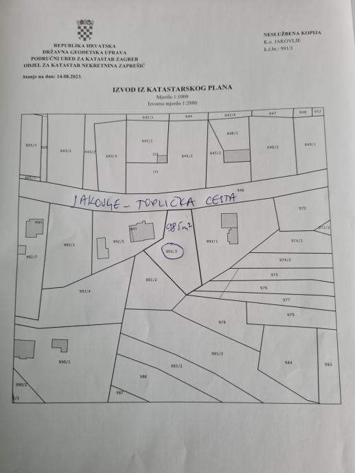 Prodajemo građevinsko zemljište površine 985 m2 u naselju Jakovlje, Toplička cesta, zemljište se nalazi uz asvaltiranu prometnicu na kojoj se struja, voda , plin , telefon.