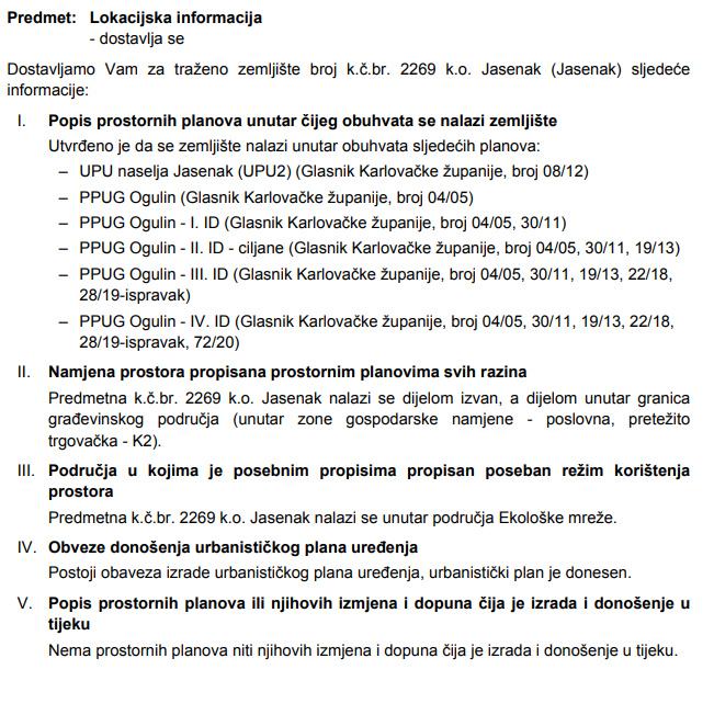 Predmetna k.č.br. 2269 k.o. Jasenak nalazi se dijelom izvan, a dijelom unutar granica