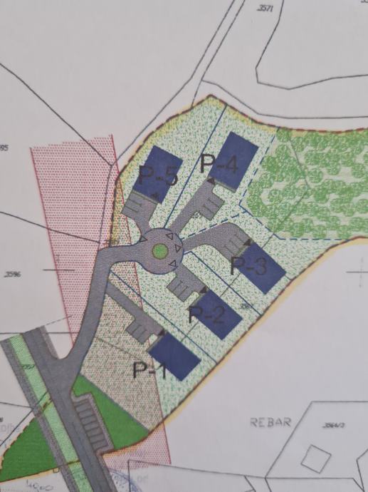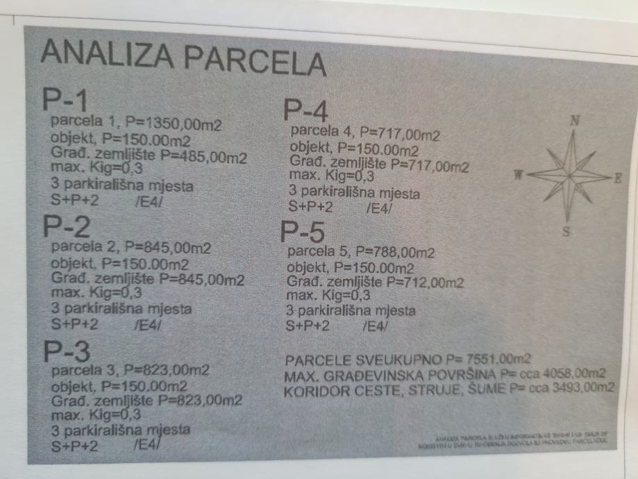 Gradilište ima vrlo visoki potencijal,napravljena je analiza i u prilogu je slika tlocrtne iskoristivosti sa 5 obiteljskih kuća.npr. P= 7551m2-P(grđ).=4058m2 P(ceste,struje,šume)3493m2