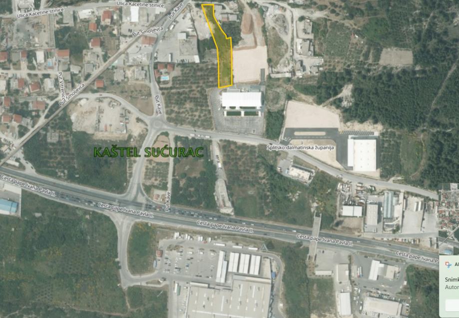 Prodaje se građevinsko zemljište u Kaštel Sućurcu, predio Idra (odmah iznad brze ceste). Pripada zoni "K" - poslovna namjena - trgovačka i uslužna. Površine 2237 m2, cijena 180€ / m2.