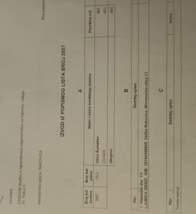 Prodaje se građevinsko zemljište od 461 m2 u Ulici Šumešec (Kladje).