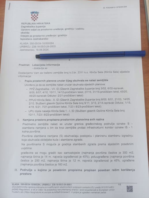 Prodajem lijepu veliku građevinsku parcelu u Klinča Sela ulica Braće Radić kčbr. 2311 k.o. Klinča Sela pravilnog oblika uz asfaltnu cestu koja je u cijelosti u građevinskoj zoni nasuprot autoservisa Gluić blizu stare Karlovačke ceste. Za zemljište je priložena lokacijska informacija iz 09 mj. 2024 godine s opisom