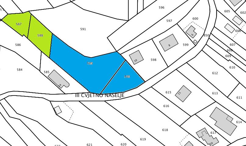 Građevinsko zemljište na atraktivnoj lokaciji, s predivnim pogledom, u Cvjetnom naselju III. u Samoboru. Obuhvaća katastarske čestice br. 590, 589, 588 i 587 ukupne površine 1.900 m2, od čega je 1.400 m2 u građevinskom području stambene namjene (način gradnje S-ob, obiteljske stambene zgrade s 1 do 3 stambene jedinice i GBP do 400 m2), pri čemu postoji mogućnost formiranja tri građevinske čestice. Zemljište je udaljeno 2 km od centra Samobora i dobro je prometno povezano (3 min vožnje do ulaza na autocestu, 5 min pješke do javnog prijevoza). Mogućnost priključenja na kompletnu infrastrukturu (struja, vodovod, odvodnja, plin, telekomunikacije). Vlasništvo je uredno.