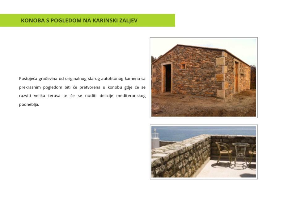Na zemljištu od 17232 m2 se nalazi potpuno nova, u istom gabaritima kakva je bila stara, izgrađena je kamena kućica po uzoru na autohtone kuće u tom kraju. Rađena od najkvalitetnijeg domaćeg kamena i legalizirana.